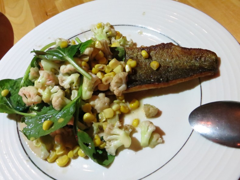 Rainbow trout in anchovy sauce with cauliflower and corn, photo by Christine Willmsen