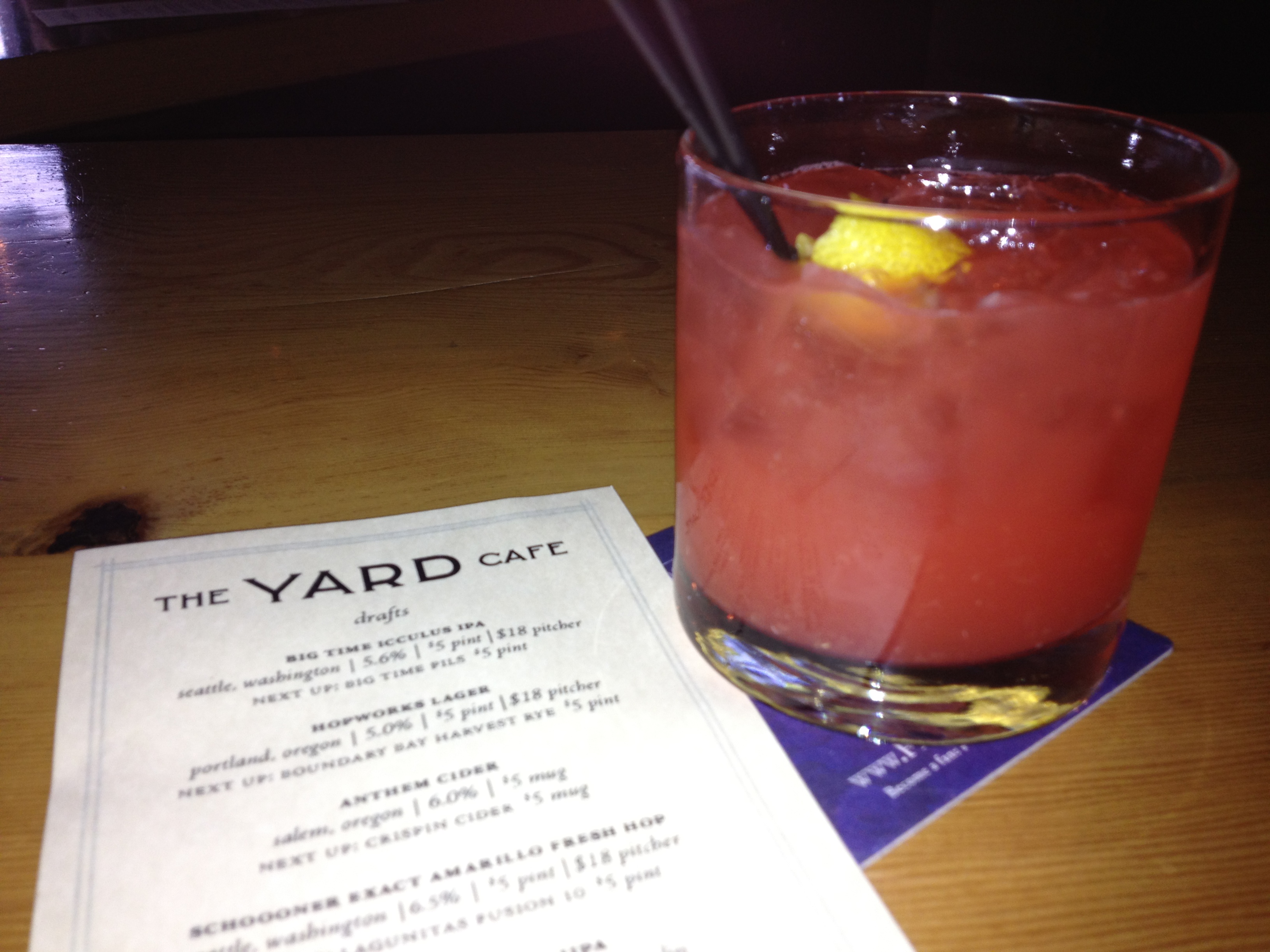 A drink you can nurse while chatting with new friends is the Burnt Orange, with rye, Grand Marnier, orange juice and bitters. But don’t forget the draft beer list with ever-changing taps of cider, IPA, pilsner, stout and more. The owners of the Dray in the Phinney Ridge neighborhood of Seattle also own the Yard – which is spelled backwards.